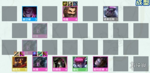 4阶段:4-1升7,这时候如果蚂蚱不来有阿狸就直接让阿狸打工,但2星蚂蚱不换1星阿狸,继续攒钱升8,沿路留烈娜塔可以配2学者,奥利安娜可以配2白魔法,斯维因不要动,他直接跟维克托互换即可,还可以当中期的前排