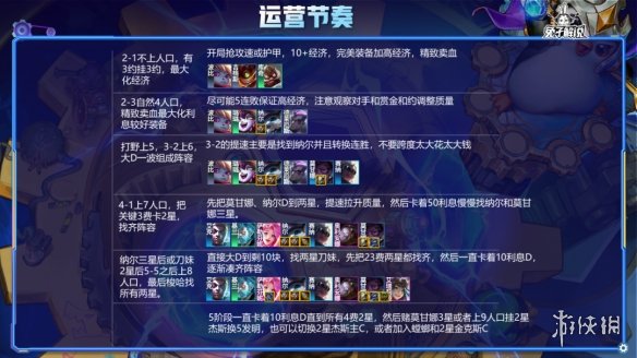 开局抢攻速或护甲,前期卖血保证纳尔双泰坦和莫甘娜肉装,前期不上人口,尽可能精致5连败但是不刻意卖血5连败但是不能1胜1负要保证高经济,打野上5,3-2上6人口,D一波找到纳尔提升质量保证中期的连胜,4-1彻底组成阵容之后卡着50利息赌三星纳尔和莫甘娜即可,莫甘娜和纳尔其中一个三星即吃分,纳尔三星基本能进决赛圈,纳尔三星之后上8人口挂刀妹即可。
