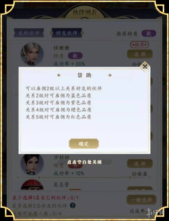 佳人们在自身伙伴不足时,还能雇佣2级以上关系好友的伙伴,好友关系等级越高,可雇佣的伙伴品质也就越高。