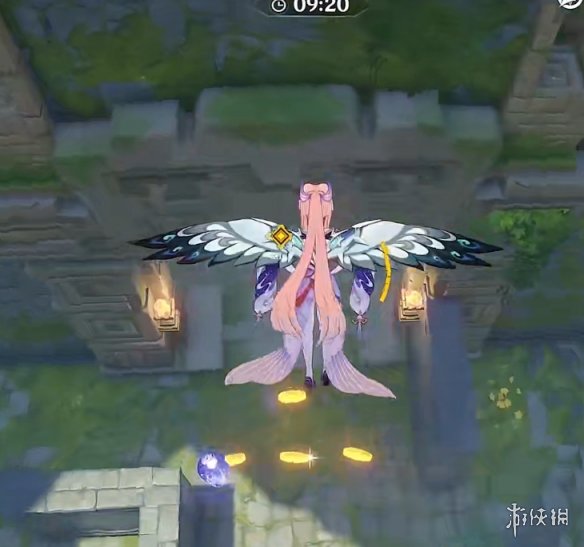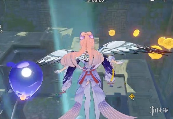 继续借助风场起飞来到地图中间风场,吃掉一串金币