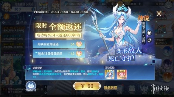 礼包内容(60元):1级璨境女神·星绛*1+神钻*600(分为14天返还)