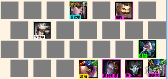 卡蜜尔、基兰、蕾欧娜、奥莉安娜、德莱文、布隆、烬、泽丽