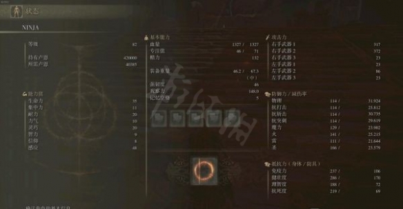 主要偏向血量与感应属性,图为最终通关属性(带大卢恩)。