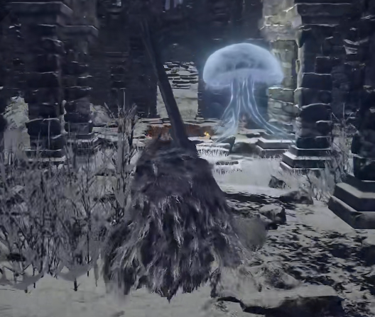 玩家在雪山的观星废墟可以找到上图的水母,他在找他的姐姐库菈菈,其实我们注意看骨灰介绍就知道了,风暴山丘破屋中小红帽给的水母骨灰名字就叫库菈菈,所以很简单了,我们在这个位置召唤出水母骨灰即可完成,然后后面的雾门即可打开,我们可以进去打开宝箱。