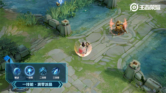 被动:王昭君脱离战斗后会获得可抵免450(+52%法术加成)点伤害的寒冰护盾,护盾对物理攻击者施加冰冷效果。护盾破裂时对附近敌人造成一次冰霜冲击造成450(+52%法术加成)点法术伤害并减少其50%移动速度,持续1秒;王昭君第三次普攻出发3枚尖刺总共造成240(+30%法术加成)点伤害冰冷效果:减少目标50%移动速度与30%攻击速度持续1秒