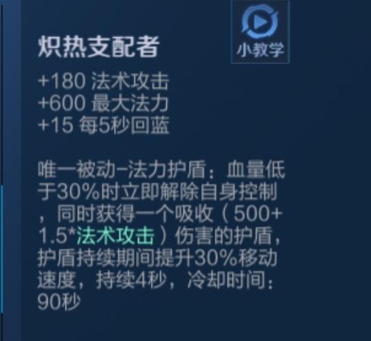 辉月作为法师的核心保命技能,当对于很多新手玩家都是比较鸡肋的。很多时候我们会发现,自己辉月还没使用就已经阵亡了(辉月传家宝),有或者太早使用,导致其毫无价值。那么这一个时候非常推荐大家选择炙热支配者,其被动的法力护盾是被动技能,只要自己血量低于百分之三十的时候就会触发,形成一个高额护盾,而且会提升移动速度,是非常值得新人玩家使用的一个保命装备。