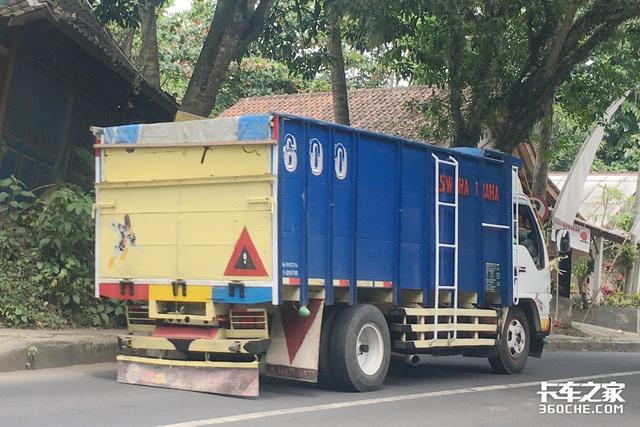 印尼路上的五十铃ELF轻卡,虽然是厢式车但是没有带导流罩,因为速度跑不起来。