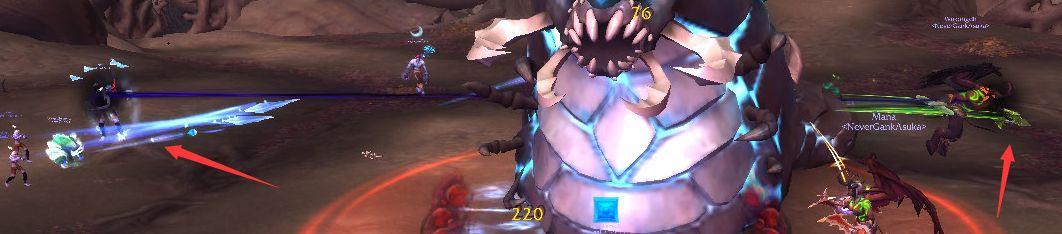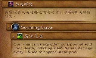 召唤四个小虫子,如上图箭头所示。出现的位置非常分散,坦克要第一时间拉住几乎是不可能的,所以最好DPS风筝一下或者带到坦克身边。小虫子死后会出现绿水,如上图红圈所示,所以尽量把小虫子集中起来击杀(话虽如此但其实打起来场面混乱,基本管不到小虫子死在哪里)。