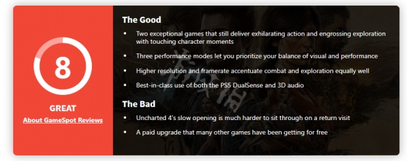神秘海域盗贼传奇合辑仍然提供令人兴奋的动作、引人入胜的探索以及感人的角色刻画。但是缓慢开局让玩家难以忍受,需要付费升级也对老玩家并不友好。