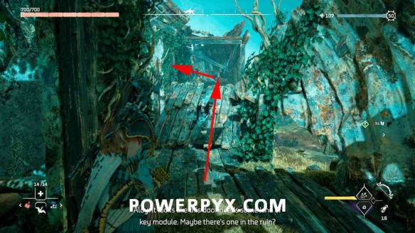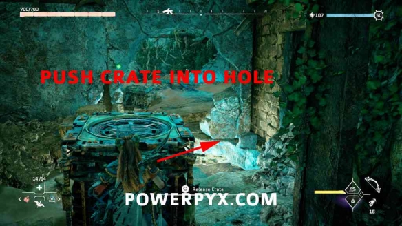 第1步:从废墟的北部开始。有一个板条箱,您可以在 ( :l2:+ :三角形:> hold :r2:) 上使用拉脚轮。把它拉进大楼。从板条箱中,您可以爬上壁架到红色发光门所在的位置。