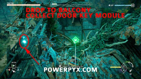 第11步:回到废墟的北边,红色发光的锁门所在的地方,我们从步骤1开始。插入钥匙模块,输入代码1705,拿起门后的绿色装饰遗物。