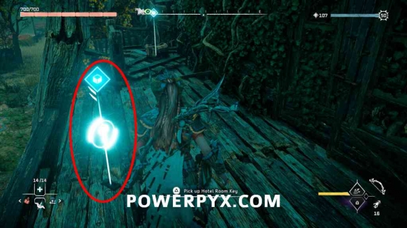 第7步:返回洞穴(向上),然后在易碎墙壁上使用拉脚轮(蓝色抓钩点)。