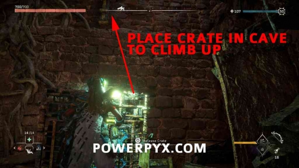 第9步:使用板条箱爬上洞穴壁,通往屋顶。