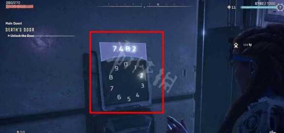 如果在门口的密码面板等了好久但没有进行操作或多次输入错误密码的话,埃洛伊会说类似“也许应该检查一下数据点,在特拉维斯·塔特处找到的日志里有个数字,它可能会起作用…是什么来着?”这样的话。