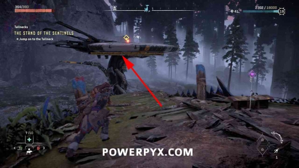 4. 在顶部左转,穿过黄色绳索,然后等待 Tallneck 绕圈。根据它在路线上的位置,它可能需要一分钟才能到达。当长颈兽在那里时,跳上它背上的黄色壁架。然后骑上它几秒钟,然后跳到另一边的木制平台上。你现在还不能爬到 Tallneck 的顶部,我们必须先爬上平台。