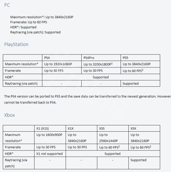PS5:最高4K、最高60帧(性能模式下),支持HDR及光追(更新补丁后);