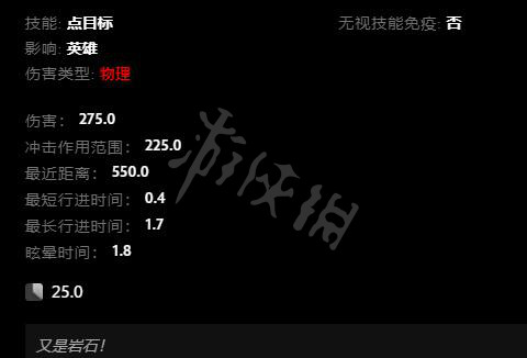 獸向目标地点扔出一块岩石,对敌人造成眩晕和伤害。岩石无法扔向獸身边的最小范围内