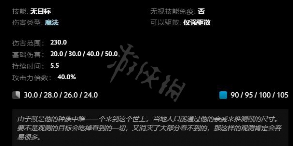 獸的脾性被动地提供基础额外攻击力。另外,獸每次受到的敌方英雄伤害超过35.0点后就会获得咤的叠加效果。 主动施放后,獸释放出咆哮声,减速附近敌人,并且獸根据咤的当前叠加层数获得额外攻击力和护甲,持续7.0秒。