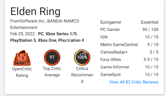 IGN认为:《艾尔登法环》是FromSoftware在《黑暗之魂》系列的基础上进行的一次大规模的升级,将其充满挑战的战斗带到一个令人难以置信的开放世界,让我们可以自由选择自己的冒险路线。