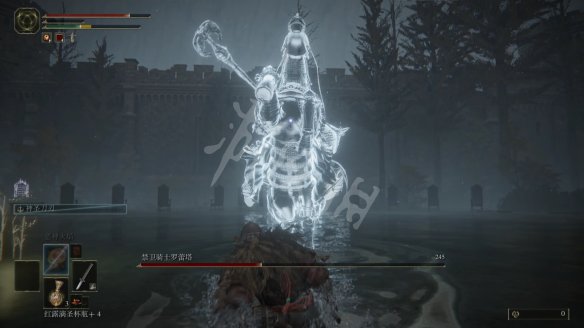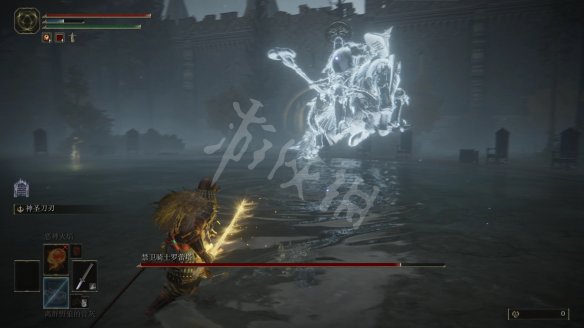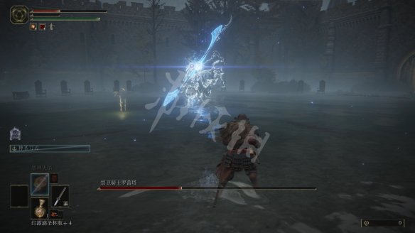 进入城内后穿过一片大手怪区域来到城寨下方的赐福点,走出去沿着城墙上的路直走到头然后左转,接着乘坐升降机来到城寨上方的赐福点,继续沿着台阶往上来到一个圆形水池的大庭院遇到Boss禁卫骑士罗蕾塔。