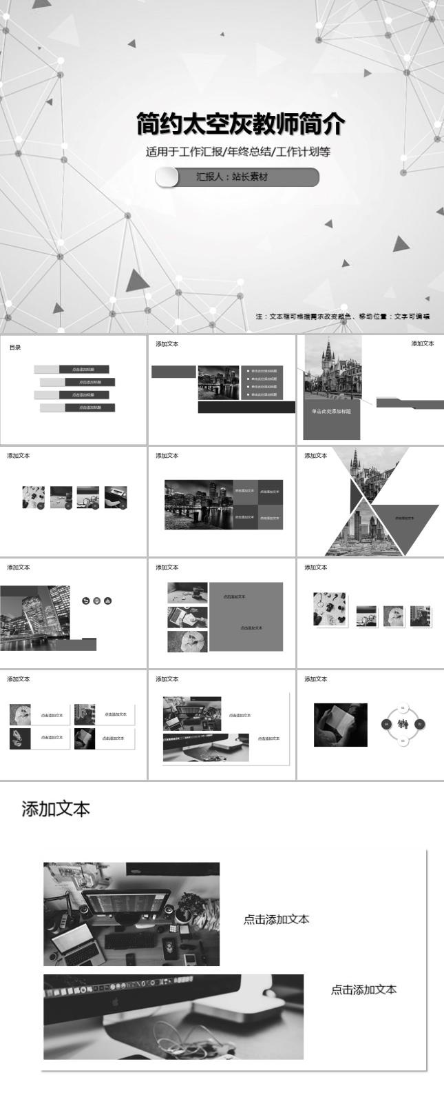 1.《简约太空灰教师简介PPT模板》援引自互联网,旨在传递更多网络信息知识,仅代表作者本人观点,与本网站无关,侵删请联系页脚下方联系方式。
